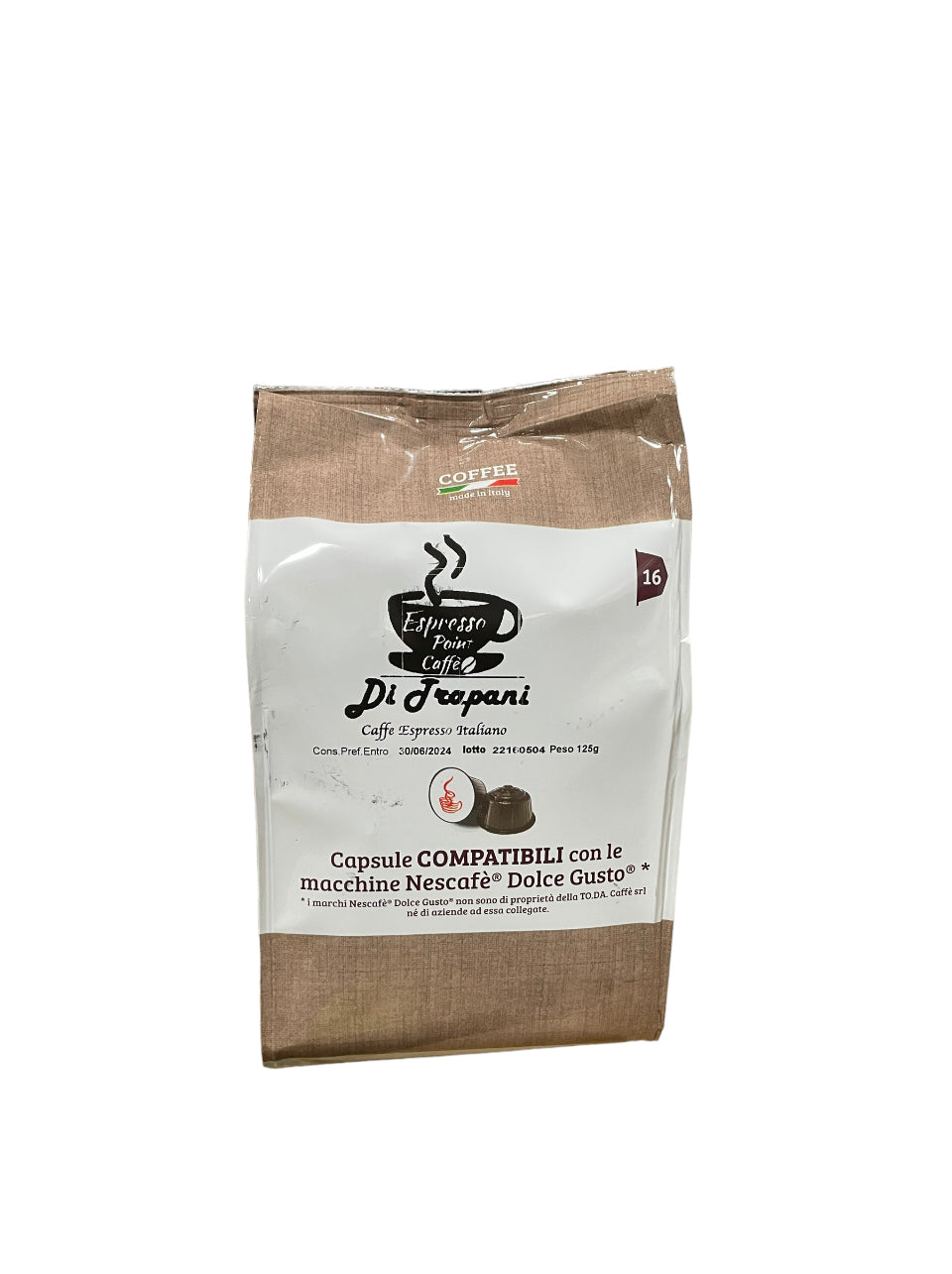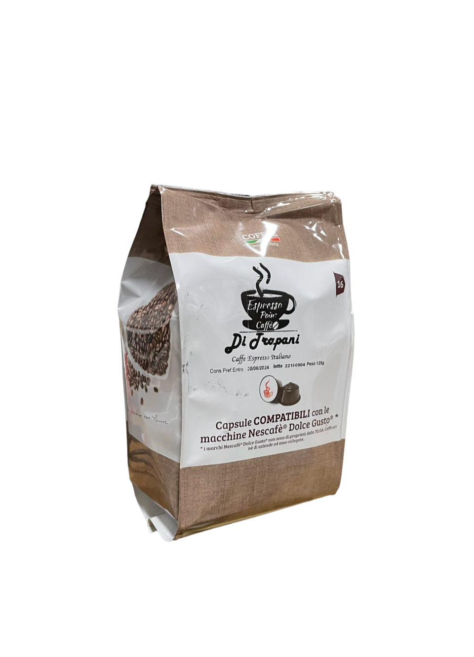 Caffè Di Trapani in capsule compatibili Dolce Gusto. Oggi è più facile che mai preparare il caffè perfetto. Questa scatola contiene 3 pacchetti da 16 capsule. All'interno troverai un caffè di alta qualità, con un aroma intenso e un gusto naturale.